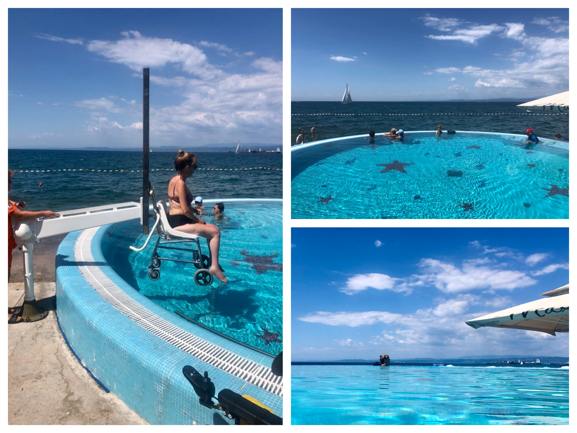 Het meest bijzondere was dat ik sinds lange tijd weer in zee heb gezwommen! Het hotel heeft net buiten de poort een ‘eigen’ stukje kade geclaimd. Hier staan ligbedjes en is een klein terras met kleine snacks en een drankje. De hele dag zit hier een super vriendelijke strandwacht die je via en betonnen hellingbaan de zee in wil helpen. Er staat een handbewogen rolstoel, type tanker klaar en op het einde drijf je zo de stoel uit en is het bijna direct diep. Er zijn ook verschillende drijfhulpmiddelen die je kunt lenen. De zee was best ruw en de golven klapten tegen te kade, dus ik dacht in eerste instantie ‘amenooitnie’… maar toen ik de een na de ander de hellingbaan over zag gaan kon ik niet achterblijven natuurlijk. Ik moest me even overgeven aan de golven maar toen ik zag dat de baywatch alles goed in de gaten hield lukte ook dat heel aardig. Helaas hebben we geen foto van het moment in zee.
