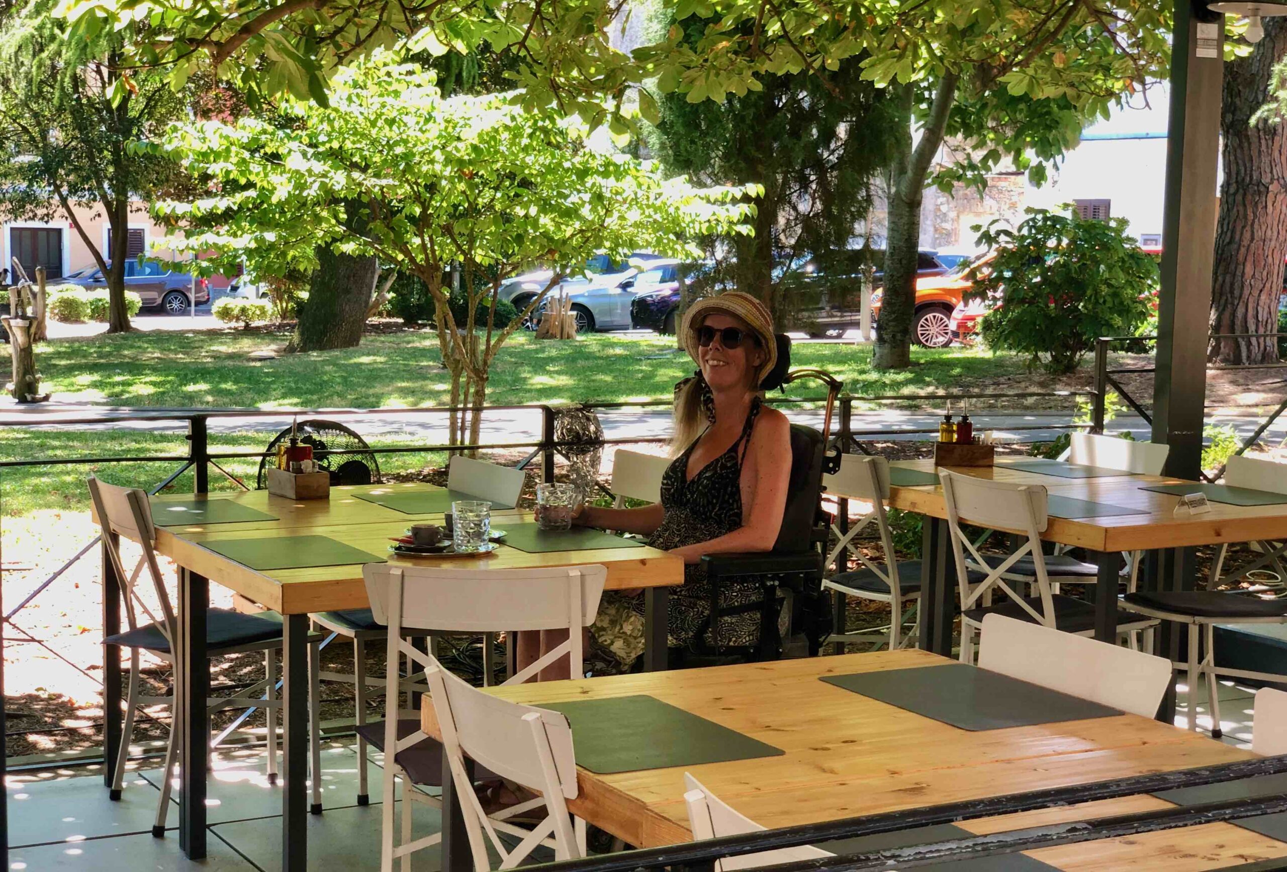 Ik wil wel eerlijk zijn, het was even schakelen om na twee weken naturistisch kamperen, weer aangekleed tussen vier muren in een door airco gekoeld hotel te zijn. Met 26 rolstoeltoegankelijk kamers zijn er natuurlijk ook aardig wat rolstoelers, alhoewel het zeker geen eis is als je het hotel boekt. Maar het is even alsof ik bij de Hoogstraat in Utrecht naar binnen rol. Ik keek er naar uit om lekker luxe aan te schuiven bij het ontbijt en direct uit een echt bed onder ‘mijn eigen’ douche te springen. Maar het binnen zijn voelt opgesloten en het geluid van bestek en borden in de vrij steriele ontbijtruimte lijkt ineens zo hard. De airco maakte mijn keel rauw. Wat mis ik de zeebries die door ons (slaap)busje waait en het leven zonder kleren!