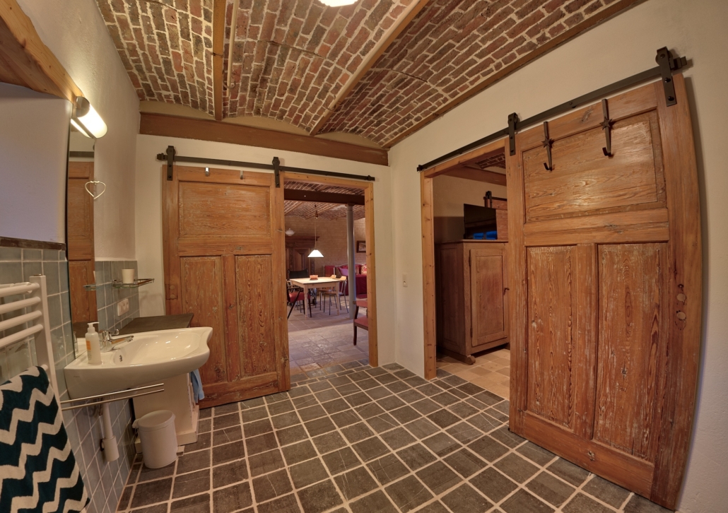 Bij binnenkomst is het wel even wennen in ons vakantiehuisje in de Belgische Voerstreek. Er staan zeker acht stoelen te veel, we zijn maar met twee. De olieverfschilderijen zijn erg aanwezig, net als de grote rode fauteuils. Vanuit de woonkamer kijken we op een betonnen erf. De badkamer is wel heerlijk ruim en ik hou direct van de combinatie van de sfeervolle grenenhouten schuifdeuren, de grijsblauwe tegeltjes en het bakstenen bogenplafond. Met het hoog-laag bed kan ik zelf mijn bed uit, ook fijn.