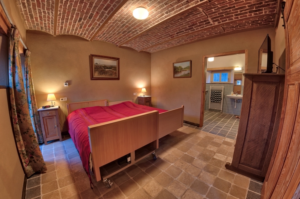 In de slaapkamer staan twee elektrisch verstelbare (hoog-laag) bedden (laagste stand 60 cm), de bedden staan standaard tegen elkaar (helaas wel met een opening ertussen), dan is er aan beide zijde genoeg ruimte voor een rolstoel. De bedden kunnen ook anders opgesteld worden, voor meer ruimte.