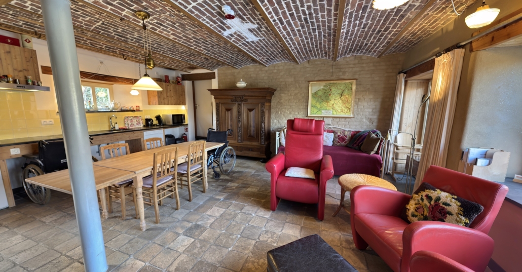 Appartement de Cour heeft het A+ label van Toerisme Vlaanderen. Er is een ruime woonkamer met zitje en een eettafel. In de woonkamer staat ook een bed, opgemaakt met allerlei kussens zodat je er ook op kunt ‘chillen‘. De keuken heeft een keramische kookplaat, het werkblad is onderrijdbaar maar heeft een normale hoogte (onderrijdbaar 70 cm, werkhoogte 90 cm). Het hele appartement heeft een stenen vloer met vloerverwarming, dus een heel comfortabele temperatuur. Er zijn geen drempels tussen de verschillende ruimten.