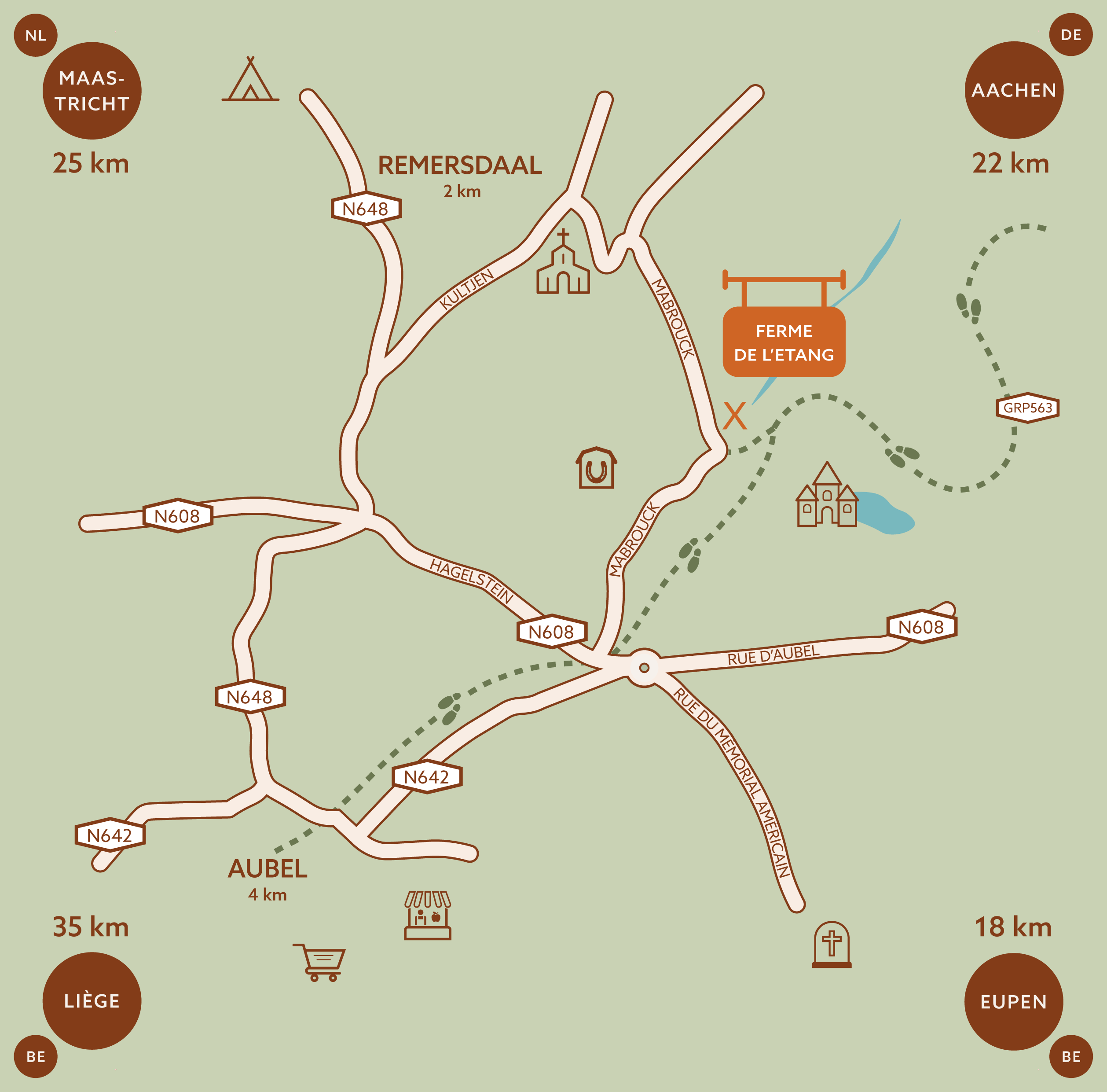 De boerderij van Hans en Tytsje vormt met nog vijf andere boerderijen het gehucht Mabrouck, vlakbij het rustige dorpje Remersdaal in de Belgische Voerstreek. Een half uur onder Maastricht en net boven de Ardennen. Je vindt er vooral rust en natuur. Voor de boodschappen ga je naar het verderop gelegen plaatsje Aubel (3,5 km). Met de auto ben je ook in een half uurtje in Aken. Luik ligt iets verder, op 45 minuten.