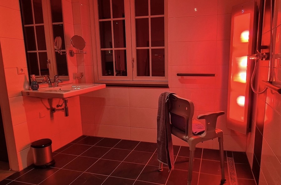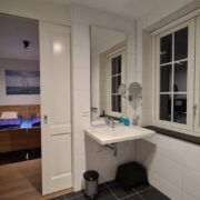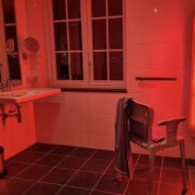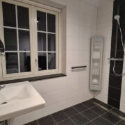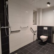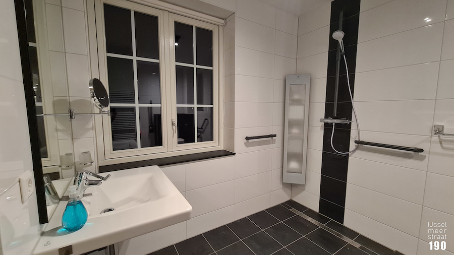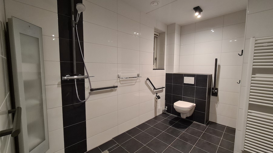 De badkamer grenst direct aan de slaapkamer en beschikt over een onderrijbare wastafel, toilet (hoogte 47) en inloopdouche. Geniet onder de douche van de sunshower met infrarood en UV-functie. De aan/uit schakelaar zit bovenop het apparaat, ik kon er niet bij als ik op de douchestoel zat. De Etac-swift-douchestoel heeft verstelbare poten en verwijderbare rug- en armleuningen. Bij het toilet is aan de muur een vaste beugel geplaatst en aan de open kant een opklapbare beugel. Beide beugels zitten vrij ver van het toilet (zie foto). Tussen de slaapkamer en badkamer zit een schuifdeur. De badkamer is ook vanuit de hal bereikbaar met een smalle deur.