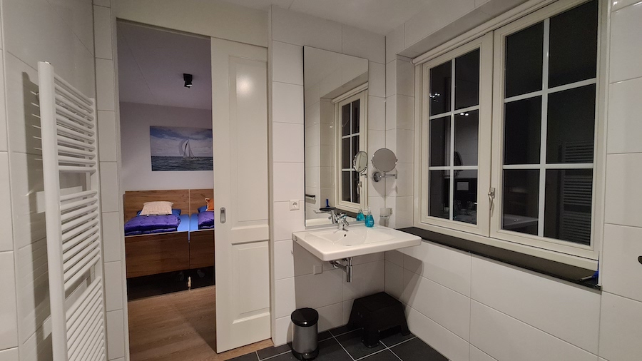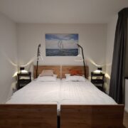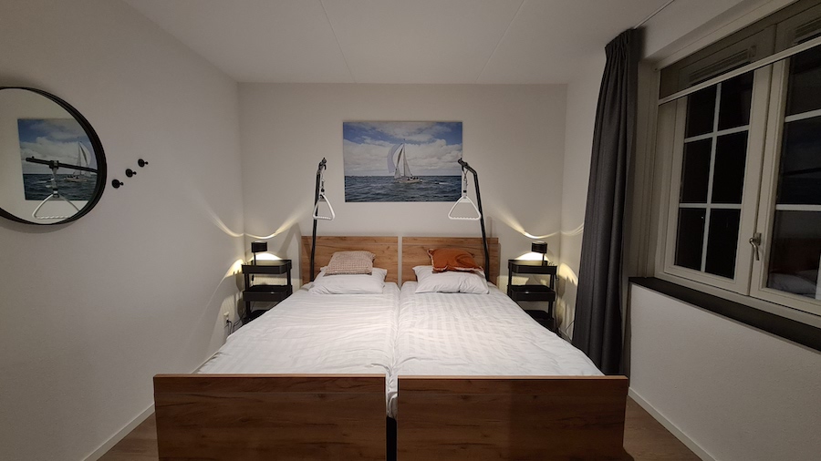 In de slaapkamer op de begane grond staan 2 verrijdbare, elektrisch verstelbare bedden (90×200 cm). De bedden zijn in hoogte verstelbaar van 39 tot 94 cm (incl. matras 14 cm) en kunnen op verschillende manier in de kamer geplaatst worden, net wat voor jou handig is. Als de bedden tegen elkaar aan staan (zoals op de eerste foto) dan is er aan één kant voldoende ruimte voor een rolstoel. De Kubivent matrassen vond ik erg lekker liggen, stevig maar niet drukkend. Overigens had ik bij het in – en uitslapen last van de scherpe bedrand, die boven de matras uitstak. Achteraf geeft Gerhard aan dat de rand maar aan één kant hoger is. Dus dat is even goed kijken hoe de bedden staan. Gerhard gebruikt zelf een tillift, deze is niet aanwezig in de woning. De nachtkastjes zijn verrijdbaar. Bij ieder bed kan eventueel een papegaai geplaatst worden. Verduisterende gordijnen en een insectenhor zorgen voor ongestoorde nachten.