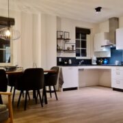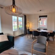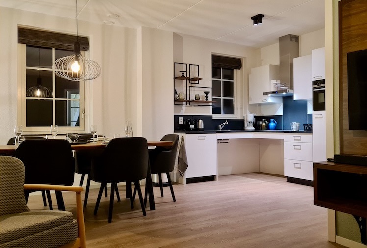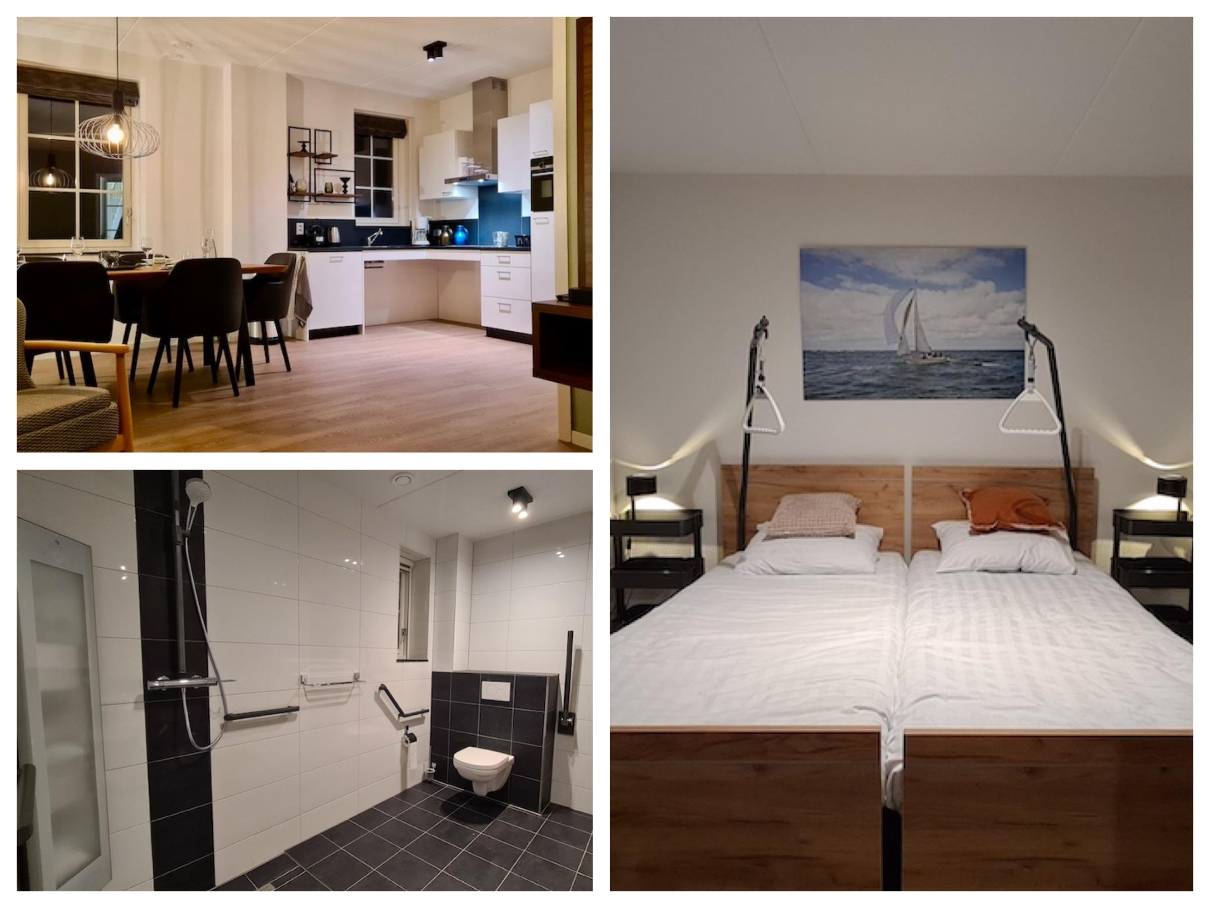 De begane grond is drempelloos en heeft een gladde houtlook tegelvloer. Alleen bij binnenkomst zit een kleine drempel (2 cm). De volledig ingerichte keuken is onderrijdbaar maar wel op standaard hoogte (onderkant 72 cm, bovenkant 81 cm). Voor de deur van het huisje zijn twee parkeerplaatsen.