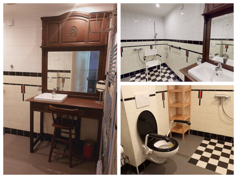 De badkamer is ruim, met inloopdouche, toilet en onderrijdbare wastafel (onderwijs 73 cm). Er kan gebruik gemaakt worden van een losstaande douchestoel (zithoogte 49 cm) met opklapbare armleuningen. In de douche hangt een beugel aan de muur. Het toilet is 45 cm hoog en heeft opklapbare armleuningen die stevig onder de WC-bril geplaatst worden. Let op, er zijn dus geen opklapbare beugels aan de muur bij het toilet! Er is wel ruim voldoende plaats voor een zijdelingse transfer (links en rechts) of recht tegenover het toilet.
