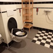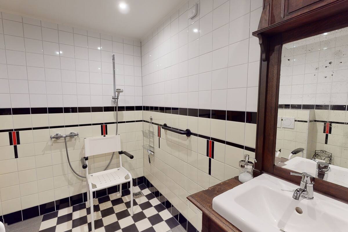 De badkamer is ruim, met inloopdouche, toilet en onderrijdbare wastafel (onderwijs 73 cm). Er kan gebruik gemaakt worden van een losstaande douchestoel (zithoogte 49 cm) met opklapbare armleuningen. In de douche hangt een beugel aan de muur. Het toilet is 45 cm hoog en heeft opklapbare armleuningen die stevig onder de WC-bril geplaatst worden. Let op, er zijn dus geen opklapbare beugels aan de muur bij het toilet! Er is wel ruim voldoende plaats voor een zijdelingse transfer (links en rechts) of recht tegenover het toilet.