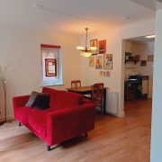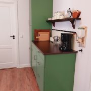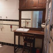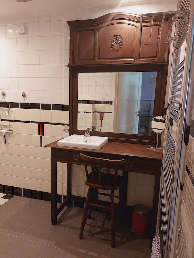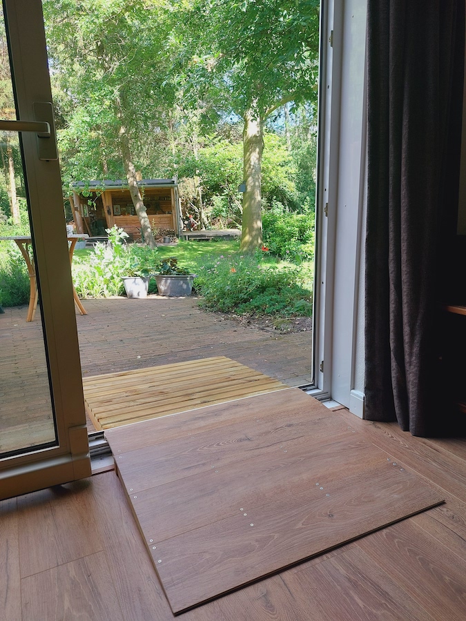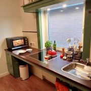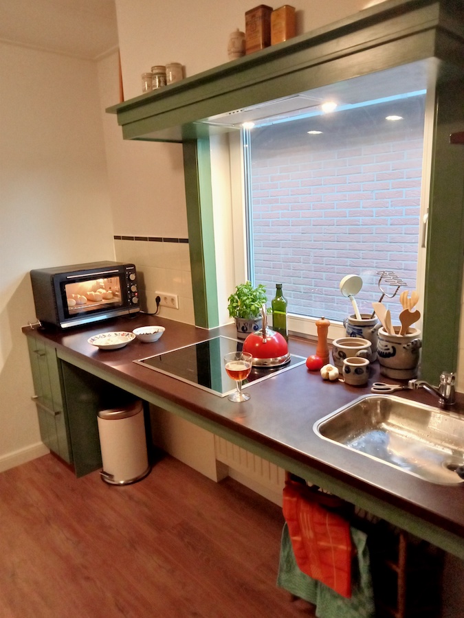 Zowel de toegang vanuit de tuin als via het curiosawinkeltje zijn voorzien van een mooie, lange drempelhulp onopvallend in hetzelfde hout als de vloer! Mooi gedaan! Het aanrecht in de knusse keuken is onderrijdbaar (onderzijde 73 cm); werkruimte, inductiekookplaat, ondiepe spoelbak, oven en vaatwasser zijn dan ook in dit gedeelte.